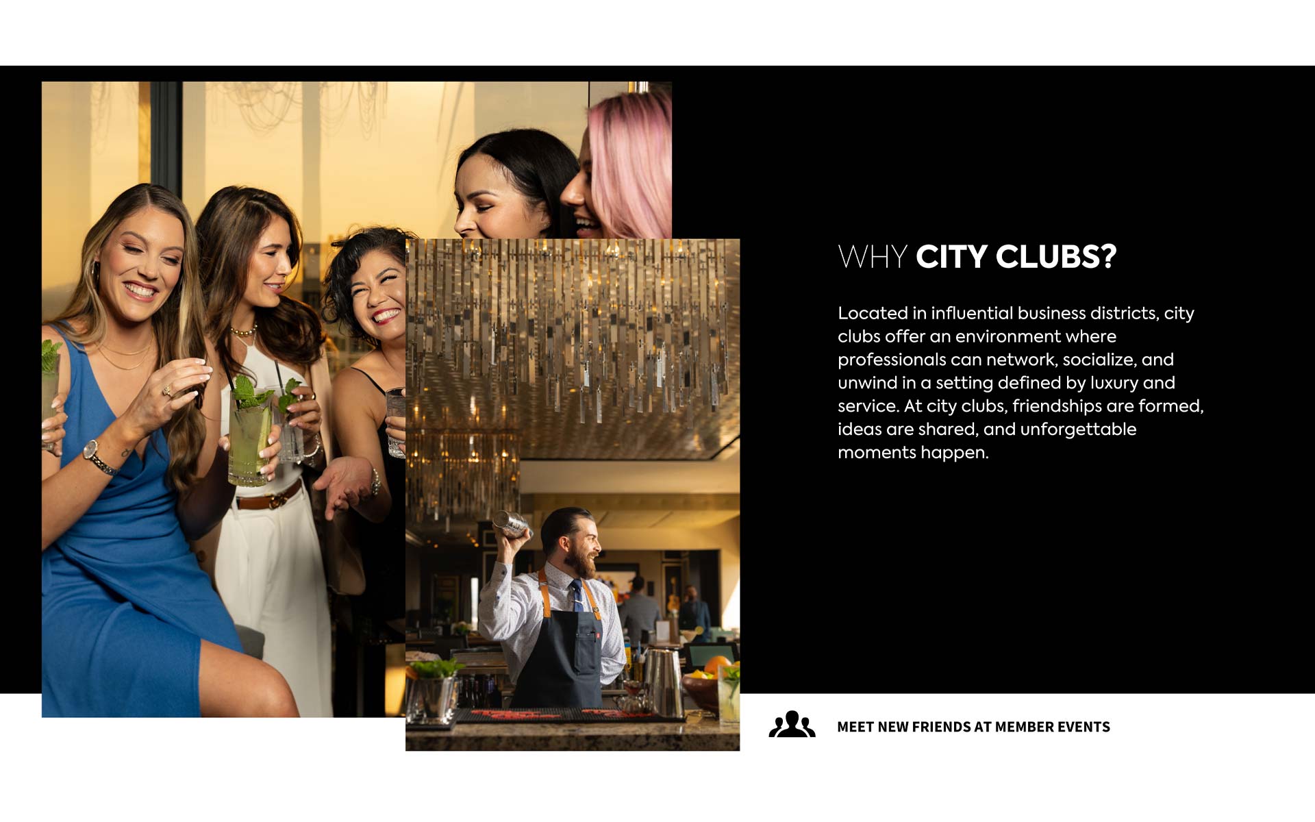 The City Club Collection is about finding your people, a place where you’re known, welcomed, and genuinely connected. A City Club is a private, members-only business and social club in the heart of the city center, brought to life through shared experiences, curated events, and moments that bring people together. It’s where days naturally turn into nights, conversations turn into friendships, and community feels familiar wherever you go. With nationwide access, that sense of belonging is always within reach.